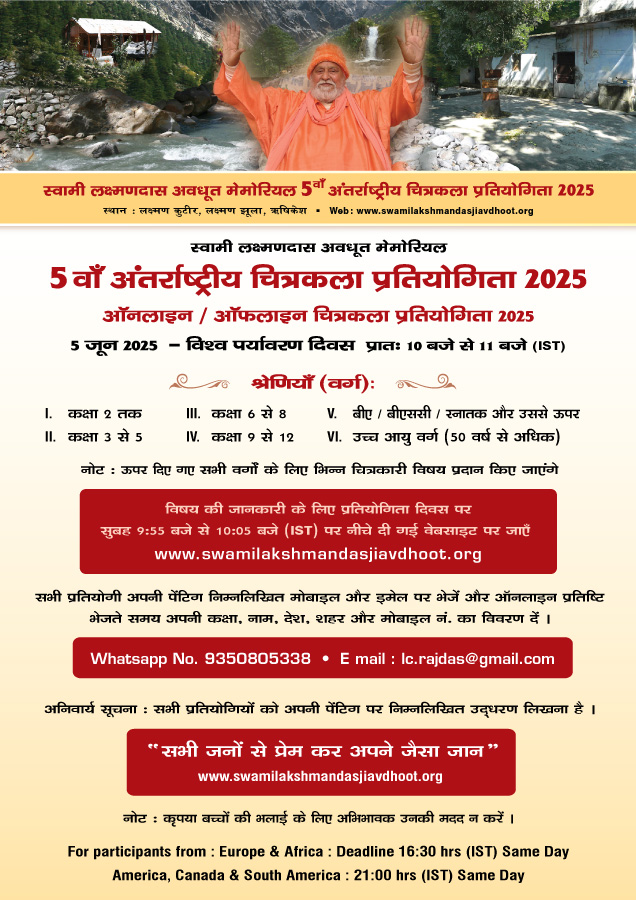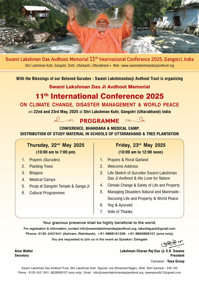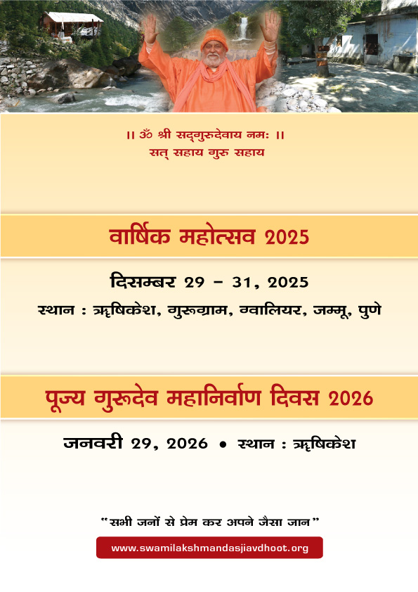 India has the rare distinction of almighty God deciding time and again to take birth on its sacred soil. As an incarnation he took birth in the form of Lords Rama, Krishna, Buddha, Mahavir, Adi Shankaracharya, Swami Ramkrishna Paramhansa, Swami Vivekananda and so on. In the same chain of events descended Swami Lakshmandas ji Avdhoot, one of the Greatest Saints of 20th century India, He lived in the heavenly abode of Himalaya on the bank of river Ganges in the holy city of Rishikesh and Gangotri intermittently.